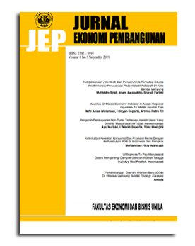 Jurnal Ekonomi Pembangunan (Journal of Economic Development)�ISSN: 2302-9595, e-ISSN: 2721-6071 is a peer-reviewed, scientific journal by Faculty of Economics and Business Lampung University collaboration with APSEPI. Jurnal Ekonomi Pembangunan is issued three times yearly in April, August, and December. The Redaction Board accepts only research in the field of legal science that is already in the form of a journal article to be considered for publication. The aims of Jurnal Ekonomi Pembangunan are to provide immediate open access to its content in the principle of making research freely available to the public as a support for the greater global exchange of knowledge. Jurnal Ekonomi Pembangunan is available in both print and online versions. The language used in this journal is English.�Scope of articles published in�Jurnal Ekonomi Pembangunan�is consistent with a broad range of topics in the field of economics, including Public Economics, Development Economics, Monetary Economics, Regional Economics, and Planning Economics.�It was first published in 2012. The Journal has been indexed by Google Scholar, SINTA 3, Garuda. Registered Member of Publication International Linking Association, (PILA) Inc. DOI Prefix: 10.23960